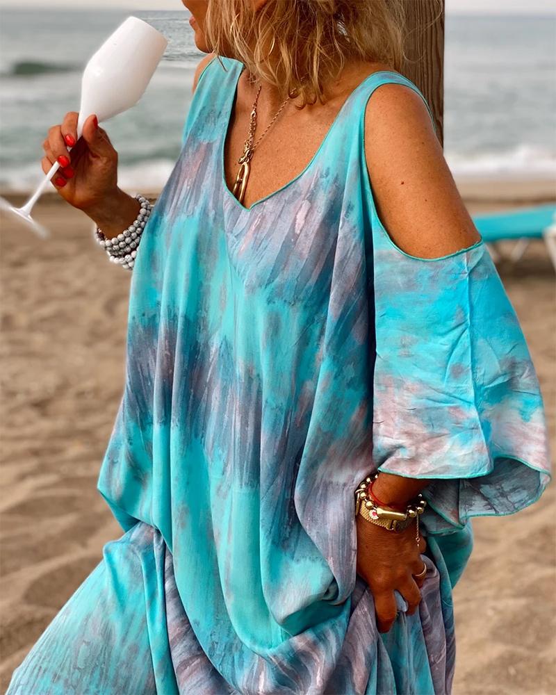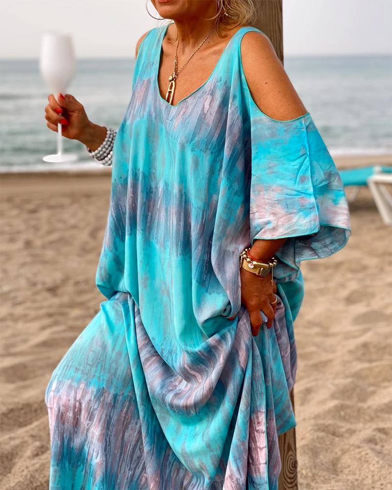 【Ship in 24 hours】Tie-Dye Print Cold Shoulder Batwing Sleeve Maxi Dress